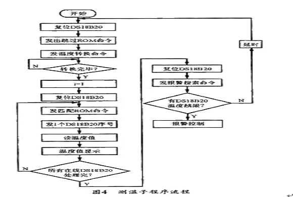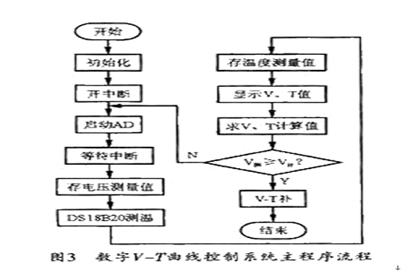 本系統(tǒng)程序主要包括主程序、讀出溫度子程序、溫度轉換命令子程序、計算溫度子程序、顯示數(shù)據(jù)刷新子程序等。編程時必須嚴格按照DS18B20的時序規(guī)定進行。尤其需要注意的是,在多點溫度測量中,由于多個DS18B20掛在一條總線上,為識別不同的器件,在系統(tǒng)安裝之前,應將主機逐個與DS18B20掛接,以讀出其序列號。具體是由主機先給DS18B20發(fā)一個復位脈沖,在DS18B20發(fā)回響應脈沖給主機后,主機再發(fā)讀ROM命令(代碼33H),并發(fā)一個15μs左右的脈沖,接著再讀取DS18B20序列號的一位,并用同樣方法讀取序列號的每一位。其V-T曲線控制系統(tǒng)主程序和測溫子程序分別如圖3和圖4所示。