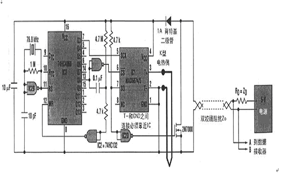 個停止位。11(或13)個數(shù)據(jù)位包括10(或12)位二進制溫度數(shù)據(jù)和1位開路熱電偶告警位。晶振保證數(shù)據(jù)的波特率精度。熱電偶感測接點必須與電路電隔離。必須確保在所有時間內(nèi)IC1工作在-20℃~85℃溫度范圍內(nèi)。遠程電源和數(shù)據(jù)接收器通過雙絞線連接電路。溫度測量IC1內(nèi)部10位ADC單次轉換實現(xiàn)并在纜線上呈現(xiàn)為串行數(shù)據(jù)字。(魯)