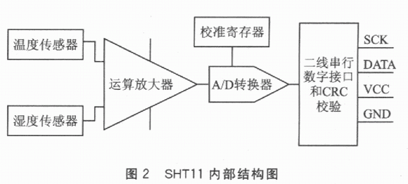 溫濕度傳感器SHTl1將溫度感測(cè)、濕度感測(cè)、信號(hào)變換、A/D轉(zhuǎn)換和加熱器等功能集成到一個(gè)芯片上,其內(nèi)部結(jié)構(gòu)如圖2所示。該芯片包括一個(gè)電容性聚合體濕度敏感元件和一個(gè)用能隙材料制成的溫度敏感元件。這兩個(gè)敏感元件分別將濕度和溫度轉(zhuǎn)換成電信號(hào),該電信號(hào)首先進(jìn)入微弱信號(hào)放大器進(jìn)行放大;然后進(jìn)入一個(gè)14位的A/D轉(zhuǎn)換器;最后經(jīng)過二線串行數(shù)字接口輸出數(shù)字信號(hào)。SHT11在出廠前,都會(huì)在恒濕或恒溫環(huán)境中進(jìn)行校準(zhǔn),校準(zhǔn)系數(shù)存儲(chǔ)在校準(zhǔn)寄存器中;在測(cè)量過程中,校準(zhǔn)系數(shù)會(huì)自動(dòng)校準(zhǔn)來(lái)自傳感器的信號(hào),此外,SHT11內(nèi)部還集成了一個(gè)加熱元件,加熱元件接通后可以將SHTll的溫度升高5℃左右,同時(shí)功耗也會(huì)有所增加。此功能主要為了比較加熱前后的溫度和濕度值,可以綜合驗(yàn)證兩個(gè)傳感器元件的性能。在高濕(>95%RH)環(huán)境中,加熱傳感器可預(yù)防傳感器結(jié)露,同時(shí)縮短響應(yīng)時(shí)間,提高精度。加熱后SHTll溫度升高、相對(duì)濕度降低,較加熱前,測(cè)量值會(huì)略有差異。