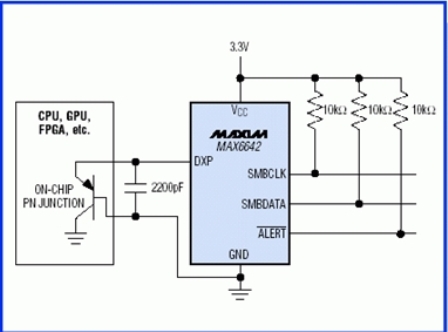 Maxim提供幾種專門設(shè)計(jì)用來精確測量熱二極管溫度并將其直接轉(zhuǎn)換成數(shù)字形式的IC。在這些IC中,其中一些可測量一個熱二極管,而有些則能同時測量多達(dá)4個熱二極管。雖然熱二極管的輸出信號電平很小(可低至200µV/°C量級),但仍大于熱電偶的輸出信號電平。內(nèi)部及外部濾波,再加上合理的電路布局,使得遠(yuǎn)端二極管溫度傳感器能夠被廣泛用于具有很強(qiáng)電氣噪聲的設(shè)備中,例如計(jì)算機(jī)、服務(wù)器及工作站等。這些IC中的大多數(shù)都能提供其他功能來保護(hù)目標(biāo)IC,例如過溫告警引腳,如果溫度超過目標(biāo)的安全工作極限,則能用它來關(guān)斷系統(tǒng)。圖2給出了遠(yuǎn)端二極管溫度傳感器(MAX6642)的一個例子。這種IC可測量熱二極管和其自身的溫度,測量上限可高達(dá)150°C,同時還提供過溫告警輸出,觸發(fā)溫度可通過SMBus編程。