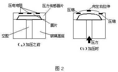 圖1為PS壓力傳感器的截面結(jié)構(gòu)圖,圖2為其傳感器部分的結(jié)構(gòu)。如圖所示,在壓力傳感器半導(dǎo)體硅片上有一層擴(kuò)散電阻體,如果對(duì)這一電阻體施加壓力,由于壓電電阻效應(yīng),其電阻值將發(fā)生變化。受到應(yīng)變的部分,即膜片由于容易感壓而變薄,為了減緩來自傳感器底座應(yīng)力的影響,將壓力傳感器片安裝在玻璃基座上。