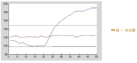 從圖1和圖2中可以看出,兩條黑線之間的數(shù)據(jù)很難斷定是哪個(gè)動(dòng)作產(chǎn)生的,因?yàn)閮蓚€(gè)動(dòng)作都可能產(chǎn)生這樣的值。所以,利用黑線之外的數(shù)據(jù)來判定是向右還是向左搖。因?yàn)閷τ谶@兩個(gè)動(dòng)作,黑線之外的數(shù)據(jù)有明顯的差異,數(shù)據(jù)相差很多。對于圖1這些數(shù)據(jù)大于150,圖2中這些數(shù)據(jù)小于90。因此這些數(shù)據(jù)至少相差60,可以很容易地將向左、向右的兩個(gè)動(dòng)作區(qū)分開。