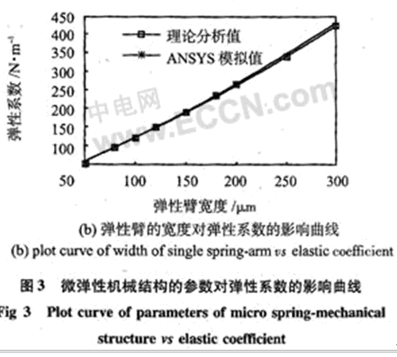分別用理論方法和ANSYS數(shù)值模擬方法得出了在b=200μm時彈性系數(shù)k隨微結(jié)構(gòu)厚度h的變化情況,以及在h=50 μm時彈性系數(shù)k隨彈性臂寬度b的變化情況,分別如圖3(a),(b)所示。圖3(a)中,2種計算方法求出的彈性系數(shù)的平均相對誤差為0.86%,圖3(b)中平均相對誤差為1.06%??梢?種方法計算出來的結(jié)果基本吻合。從上述分析可知,在彈簧臂總長確定的情況下,彈簧的彈性系數(shù)取決于微結(jié)構(gòu)的厚度h和彈性臂的寬度b,而且,和6的關(guān)系近似于線性,因此,可以根據(jù)動力學(xué)系統(tǒng)的具體要求和加工的工藝性能來選擇合理的h和b,從而滿足傳感器整體性能的要求。