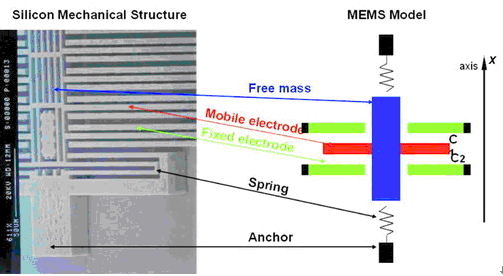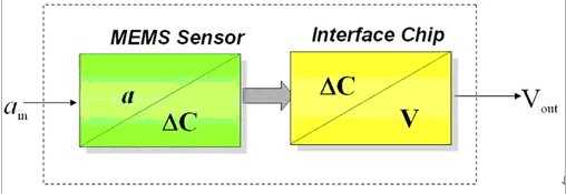 在電容式的結(jié)構(gòu)中,當(dāng)其中的質(zhì)塊出現(xiàn)加速度運(yùn)動(dòng)時(shí),就會(huì)產(chǎn)生電容量的差異變化(DC),此變化會(huì)傳送給另一顆接口芯片(Interface chip),由它來(lái)輸出可量測(cè)的電壓值。因此,一個(gè)3軸加速度計(jì)芯片中必須包含兩大單元,一是單純的機(jī)械性MEMS傳感器,它包含測(cè)量XY軸的區(qū)域及測(cè)量Z軸的區(qū)域,內(nèi)部有成群移動(dòng)的電子;另一則是標(biāo)準(zhǔn)的ASIC接口芯片,它會(huì)將電容變化轉(zhuǎn)換為電壓訊號(hào)輸出。