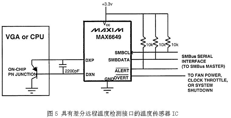 圖5為筆記本電腦普遍使用的一種溫度控制方案。溫度傳感器IC通過SMBus接口連接到筆記本電腦的嵌入式微控制器,由于溫度傳感器IC與嵌入式微控制器之間為數(shù)字接口,因此溫度傳感器IC在位置上可以遠(yuǎn)離嵌入式微控制器而不會(huì)有噪聲干擾問題。MAX6649同時(shí)內(nèi)置一個(gè)本地溫度傳感器和用于連接遠(yuǎn)端二極管的差分接口。MAX6649的IDH=100uA,IDL=10uA,高精度、小電流的電流源可減小因雜散電阻所產(chǎn)生的測(cè)量誤差。差分輸入有助于降低噪聲干擾。圖5所示電路,溫度傳感器IC只負(fù)責(zé)溫度檢測(cè),風(fēng)扇轉(zhuǎn)速控制由嵌入式微控制器完成,由軟件實(shí)現(xiàn)。為了避免軟件控制的死機(jī)問題,MAX6649還集成了保護(hù)功能,當(dāng)溫度到達(dá)第一個(gè)高溫臨界點(diǎn)時(shí),MAX6649 ALERT可發(fā)出中斷請(qǐng)求,要求嵌入式微控制器進(jìn)行相應(yīng)的處理,例如對(duì)處理器進(jìn)行降頻;如果上述對(duì)策仍無法有效抑制溫度的上升,當(dāng)溫度達(dá)到第二高溫臨界點(diǎn)時(shí),MAX6649 OVERT可以用來控制系統(tǒng)的第二個(gè)風(fēng)扇或?qū)ο到y(tǒng)進(jìn)行強(qiáng)制關(guān)機(jī)。圖5具有低成本、高精度、使用彈性大等優(yōu)點(diǎn),但在軟件的設(shè)計(jì)上需花費(fèi)較多的功夫。