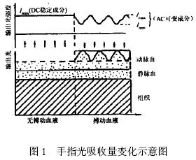 光電脈搏傳感器的研制和噪聲分析手指組織可以分成皮膚、肌肉、骨骼等非血液組織和血液組織, 其中非血液組織的光吸收量是恒定的, 而在血液中, 靜脈血的搏動相對于動脈血是十分微弱的, 可以忽略, 因此可以認(rèn)為光透過手指后的變化僅由動脈血的充盈而引起的, 那么在恒定波長的光源的照射下, 通過檢測透過手指的光強將可以間接測量到人體的脈搏信號。
