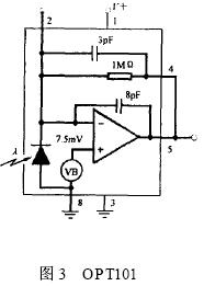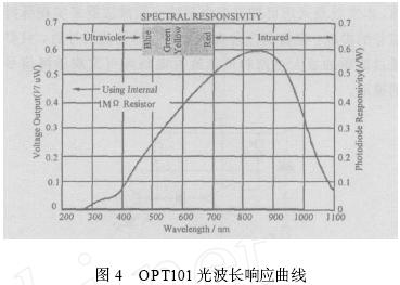 在本文中, 采用一種新型的光敏元件OPT101 , 該元件將感光部件和放大器集成在同一個芯片內(nèi)部, 這種集成化的設(shè)計方式有效地克服了后端運算放大器空載電流輸出對光敏部件輸出電流的影響, 而且芯片輸出的電壓信號可以通過外部的精密電阻進(jìn)行調(diào)節(jié), 有利于芯片適應(yīng)整體的電路設(shè)計, 同時芯片的集成化設(shè)計也能夠減小系統(tǒng)的功耗。