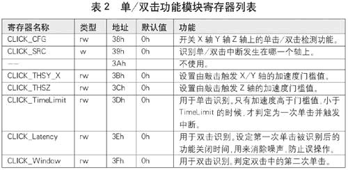 諾基亞8800CA手機除了有“翻轉(zhuǎn)靜音”的功能外,還有雙擊手機顯示時鐘的功能。其中敲擊的識別可以通過加速度傳感器來實現(xiàn)。LIS35DE集成了識別單擊或雙擊的功能模塊,通過寄存器設(shè)計就可以識別出單擊以及兩次單擊是否符合雙擊的條件。LIS35DE的單雙擊功能由地址為38h~3Fh的寄存器控制,如表2所示。