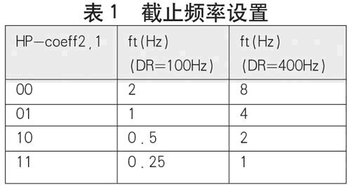 由于重力的存在,用戶不能簡單地在FF_WU_TSH1寄存器中設(shè)置統(tǒng)一的門檻值來作為晃動或者喚醒中斷的判定條件。為此,LIS35DE集成了高通濾波器,能夠濾除緩慢變化或不變的加速度(如重力加速度),并且可以選擇截止頻率,如表1所示。只有變化頻率高于截止頻率的加速度才能通過。