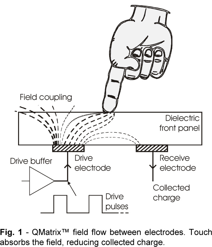 圖1 :兩個(gè)電極之間的 QMatrix 場流。觸摸可吸收該電場,導(dǎo)致所收集的電荷減少。