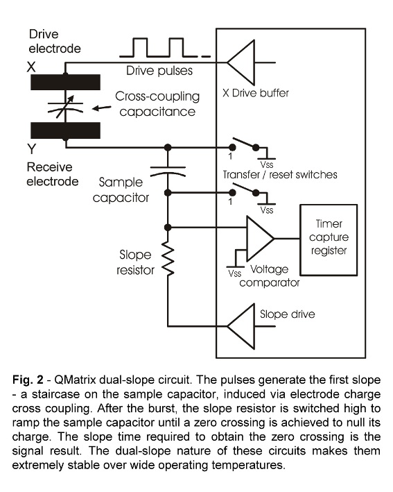 QMatrix器件采用一個(gè)掃描式的橫向電極無源矩陣,實(shí)現(xiàn)了使用單芯片驅(qū)動的大量觸摸按鍵。這種構(gòu)造可提高感測芯片的引腳利用效率,較之于每個(gè)按鍵都需要一個(gè)感測連接 (如 Qtouch™ 及許多同類器件),芯片和按鍵矩陣之間所需的連接數(shù)量較少。QMatrix 器件所需的部件最少,最大限度地降低了單個(gè)按鍵的成本。在量產(chǎn)時(shí),此器件可以令芯片成本降至每按鍵 0.05 美元。此外,這種構(gòu)造本身就具有抵抗環(huán)境變化、水膜影響以及無線電干擾的特性。