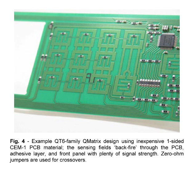 圖4:QT6 系列 QMatrix 設(shè)計(jì)示例。設(shè)計(jì)采用廉價(jià)的單面 CEM-1 PCB 材料,感測電場背對穿過 PCB 、膠層和前面板,其信號強(qiáng)度集中在前面板方向上,使用0 歐姆的跳線器作為交叉。[page]