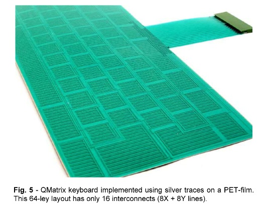 圖5: 利用 PET 薄膜上的銀線來實(shí)現(xiàn)的 QMatrix 鍵盤,這個(gè) 64 鍵布局只需要 16 個(gè)互聯(lián) (8X + 8Y線)。