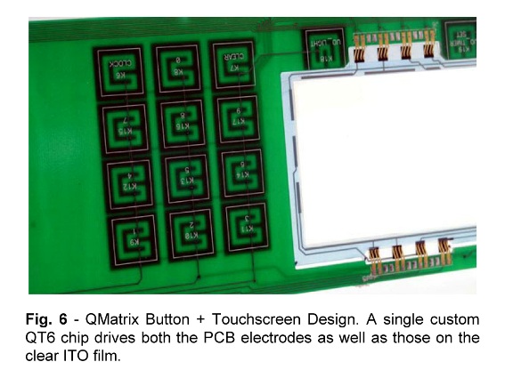 圖6:QMatrix 按鍵和觸摸屏的一體式設(shè)計(jì),利用一片 QT6 單芯片同時(shí)驅(qū)動 PCB 電極以及 ITO 薄膜上的鍵盤。