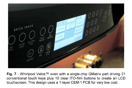 圖7:Whirlpool Velos 微波爐采用單芯片 QMatrix 來驅(qū)動 21 個(gè)傳統(tǒng)的觸摸按鍵,以及構(gòu)成 LCD 觸摸屏的 10 個(gè)透明式 ITO 薄膜式按鍵。該設(shè)計(jì)采用了單層 CEM-1 PCB,成本很低。