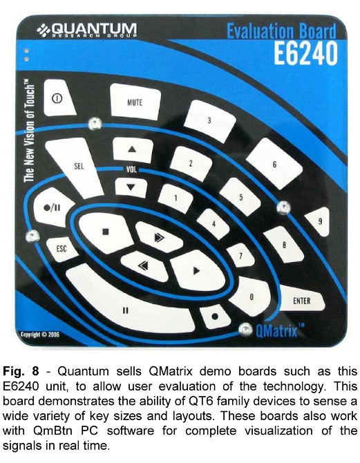 圖8 :量研科技銷售 QMatrix 演示版如 E6240,為用戶提供該技術(shù)的評測手段。該評測板可以支持各種按鍵尺寸和布局,演示 QT6 系列器件的強(qiáng)大功能。QMatrix 演示版還可配合 QmBtn 軟件使用,以進(jìn)行按鍵實(shí)時(shí)信號的全景視象化觀測。