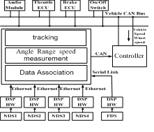 數(shù)據(jù)融合系統(tǒng)采用分布式體系結(jié)構(gòu),即每個近距離傳感器對獲得的回波信號先進行局部處理,然后送入融合中心進行融合以獲得目標的方位、速度信息。控制器是整個雷達網(wǎng)絡(luò)系統(tǒng)的最終決策機構(gòu),它負責識別目標的距離和速度信息是否對行車安全構(gòu)成威脅,并通過聲光的形式提示駕駛員或者直接作用于車載控制系統(tǒng)加以調(diào)整。