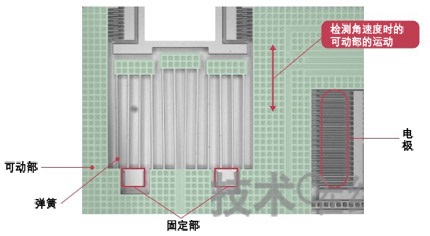 新傳感器由MEMS中常見的固定部、可動部、連接固定部與可動部的彈簧,以及檢測可動部運動的電極構(gòu)成。利用電極靜電容量隨著可動部的運動而發(fā)生變化的特性來檢測角速度和加速度(圖2)。檢測角速度的電極只有在彎道等使車輛轉(zhuǎn)向時才檢測信號。