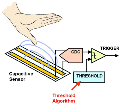 在許多情況下,接近傳感器在印制電路板包括兩個導體。中間媒介電介質(zhì)的值非常小(接近1)。如果一個物體,例如手,移動到電容器的電子區(qū)域,它就改變電容。人體的組成超過90%水,因而電介質(zhì)的值非常大(約50)。