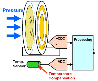 由于熱擴散,溫度傳感器需要考慮改變的幾何形狀。設(shè)想兩個電極中的一個附著在芯片上,另一個附著在由金屬或陶瓷構(gòu)成的支架上,因此支架自己作為傳感器。以陶瓷為例,能夠承受非常高的壓力和侵入的媒介。與經(jīng)典的惠斯通電橋相比較,電容壓力傳感器的主要優(yōu)點是對輸入電流的要求更低,使得他們特別適合于諸如輪胎壓力控制之類的應(yīng)用。