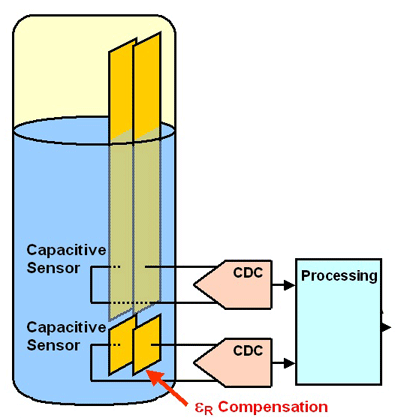 在一個液位傳感器中,一對固定的導板浸沒在要測量的液體中。制造商能夠以非常低的成本制造出印制導體。第二對導板附著在底部,可以檢測出由于溫度或其他影響導致的電介質(zhì)變化,如下圖所示。