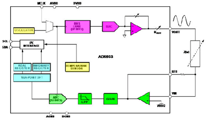 這里,傳感器的反應(yīng)通過快速的模數(shù)轉(zhuǎn)換器和快速的傅立葉分析記錄下來。采用DDS方法,初始的相位在任何時候都可精確地獲知。用同樣的方法,對其他頻率的反應(yīng)也可以測量出來。阻抗的實部和虛部可以據(jù)此計算出,并且通過數(shù)字總線輸出。完全掃描僅需要幾百毫秒。此圖對該方法進行了說明。