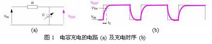如圖1(a)所示,在RC網(wǎng)絡(luò)施加周期性充電電壓Vin,測(cè)量Vout會(huì)得到如(b)的時(shí)序,通過(guò)檢測(cè)充電開(kāi)始到Vout到達(dá)某一門限值的時(shí)間tc的變化,就可以判斷出是否有人體接觸。圖2顯示出有人體接觸時(shí)充電時(shí)間會(huì)變長(zhǎng)。