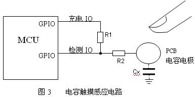 實(shí)現(xiàn)電路如圖3,使用一個(gè)I/O口對(duì)PCB構(gòu)成的電容充電,另一個(gè)I/O口測(cè)量電壓,對(duì)于多個(gè)按鍵時(shí)使用同一個(gè)I/O口充電。R1通常為幾百K到幾M,人體與PCB構(gòu)成的電極電容一般只有幾個(gè)pF,R2用于降低噪聲干擾,通常為10K。