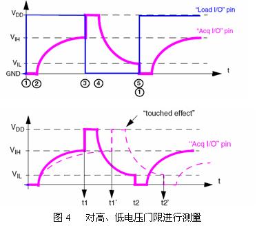 為了提高系統(tǒng)的可靠性和穩(wěn)定性,改進(jìn)的測(cè)量方法是對(duì)Vout進(jìn)行高和低兩個(gè)門限進(jìn)行測(cè)量。如圖4所示,通過(guò)對(duì)t1和t2的測(cè)量,從而達(dá)到更可靠的效果。另外,多次測(cè)量也是有效的降低高頻干擾的有效方法。