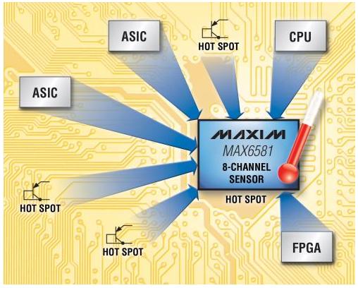 該器件能夠替代8個(gè)本地傳感器或7個(gè)單通道遠(yuǎn)端傳感器使用,并測(cè)量?jī)?nèi)置測(cè)溫二極管的外部IC的管芯溫度。MAX6581還可補(bǔ)償寄生串聯(lián)電阻。此外,通過(guò)使用分立的按二極管方式連接的晶體管,這7路遠(yuǎn)端檢測(cè)通道均可用于測(cè)量電路板溫度。