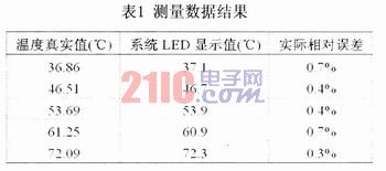 試驗(yàn)數(shù)據(jù)通過(guò)對(duì)普通熱水器加熱中的水溫進(jìn)行測(cè)量取得,測(cè)量中采用實(shí)驗(yàn)用高精密數(shù)字測(cè)溫儀的示值溫度作為被測(cè)物體溫度檢測(cè)點(diǎn)的溫度真實(shí)值,本測(cè)溫裝置測(cè)得的溫度信息經(jīng)過(guò)電路的轉(zhuǎn)換及單片機(jī)的處理后,測(cè)得的溫度信息在LED數(shù)碼管上的顯示值如表l所示。從表中的數(shù)據(jù)可以看出,本系統(tǒng)LED顯示值和真實(shí)值很接近;試驗(yàn)過(guò)程中,由于測(cè)量環(huán)境及其它因素的影響,使得系統(tǒng)的測(cè)量值在真實(shí)值上下波動(dòng),但溫度的實(shí)際相對(duì)誤差始終保持在1%以內(nèi),從而證明了本測(cè)溫裝置完全能夠滿足實(shí)際的測(cè)量要求。