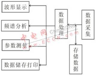 本虛擬軟件將有關(guān)測(cè)試功能集成在一個(gè)面板上,這里著重介紹LabVIEW的框圖程序設(shè)計(jì)??驁D程序是虛擬儀器的核心部分,虛擬示波器儀器主要由它來(lái)完成數(shù)據(jù)的采集、處理和顯示。本系統(tǒng)框圖程序主要包括數(shù)據(jù)采集、波形顯示、參數(shù)測(cè)量、頻譜分析和波形存儲(chǔ)及回放等5大功能模塊,如圖3示。