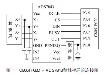 ADS7843是一種四線(xiàn)式觸摸屏控制器,目前較多應(yīng)用于電阻式觸摸屏輸入系統(tǒng)中。盡管有很多相關(guān)的典型應(yīng)用和應(yīng)用注意事項(xiàng),但是在實(shí)際使用過(guò)程中仍然會(huì)遇到一些問(wèn)題。應(yīng)用在通用的單片機(jī)中所出現(xiàn)的問(wèn)題及解決方法,已有一些介紹。本文是對(duì)基于高速、流水線(xiàn)結(jié)構(gòu)的 C8051的觸摸屏控制系統(tǒng)設(shè)計(jì)中所遇到的問(wèn)題進(jìn)行分析處理,并給出了解決方法。