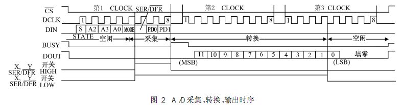 如圖 1示。ADS7843串行接口的一次完整操作需要 3× 8=24個(gè) DCL K時(shí)鐘周期,前 8個(gè)脈沖接收 8位的命令,并在第 6個(gè)脈沖的上升沿開(kāi)始 A / D轉(zhuǎn)換器進(jìn)入采樣階段,從第 9個(gè)脈沖開(kāi)始進(jìn)入轉(zhuǎn)換階段,輸出12位采樣值,轉(zhuǎn)換結(jié)束進(jìn)入空閑階段。直到 24個(gè)DCL K結(jié)束,CS置高電平,一次測(cè)量結(jié)束。如圖 2所示。此外,ADS7843還支持其他的工作方式,這里不再詳述。