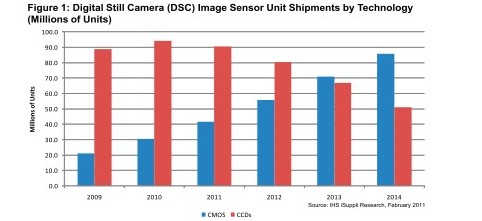 據(jù)IHS iSuppli公司的研究,數(shù)碼相機(jī)CMOS圖像傳感器出貨量未來三年將快速增長(zhǎng),到2013年將首次超過CCD。