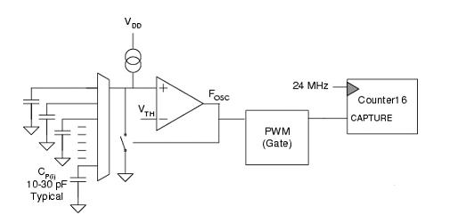 該比較器的輸出被作為一個脈沖寬度調(diào)制器(PWM)電路的時鐘輸入信號,它負(fù)責(zé)選通一個頻率為24兆赫茲的16位計數(shù)器。手指接觸傳感器時會增加電容,從而增加計數(shù)器的總值。這就是一個手指如何被感覺到方式。這個系統(tǒng)的典型波形如圖4所示