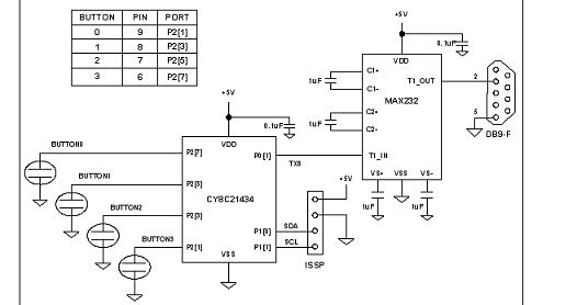 為實現(xiàn)電容式傳感和串行通信,電路設(shè)計中采用了賽普拉斯公司的CY8C21x34系列的PSoC芯片,其中包含了一組模擬和數(shù)字功能模塊,它們由存儲在板載閃存中的固件來設(shè)置。第二個芯片處理RS232電平移位,以提供與一臺主機的通信鏈路,使電容式傳感數(shù)據(jù)記錄通過串口以115200波特率傳輸給主機。四個電容傳感按鍵的引腳分配顯示在圖5中的表中。通過ISSP接口和編程引腳SCL、SDA對PSoC進行編程。ISSP接口中包含電源和地,而PC主機連接到電容式傳感電路板通過標(biāo)準(zhǔn)的DB9連接器。