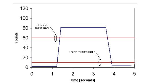 同時還給出了門限值。噪聲門限被設(shè)定的計數(shù)值為10,而手指門限設(shè)定的計數(shù)值則為60。實際上,在實際計數(shù)數(shù)據(jù)中始終存在噪聲分量,圖中并未顯示,以便能清晰地顯示門限水平。