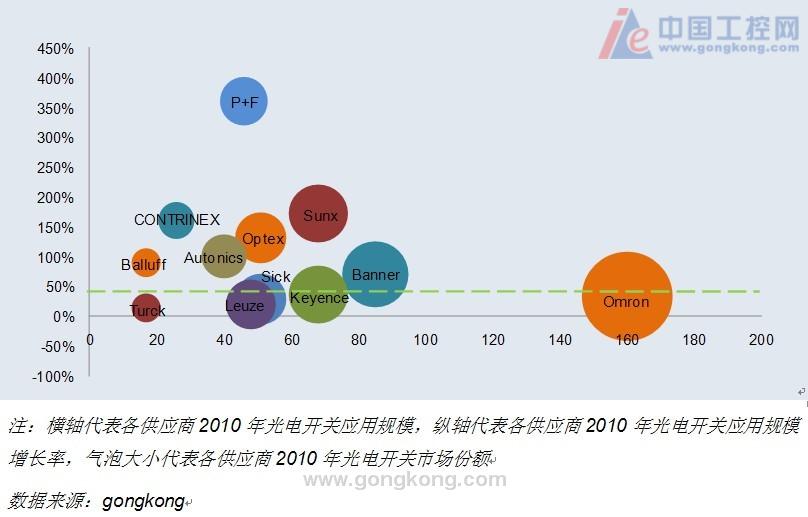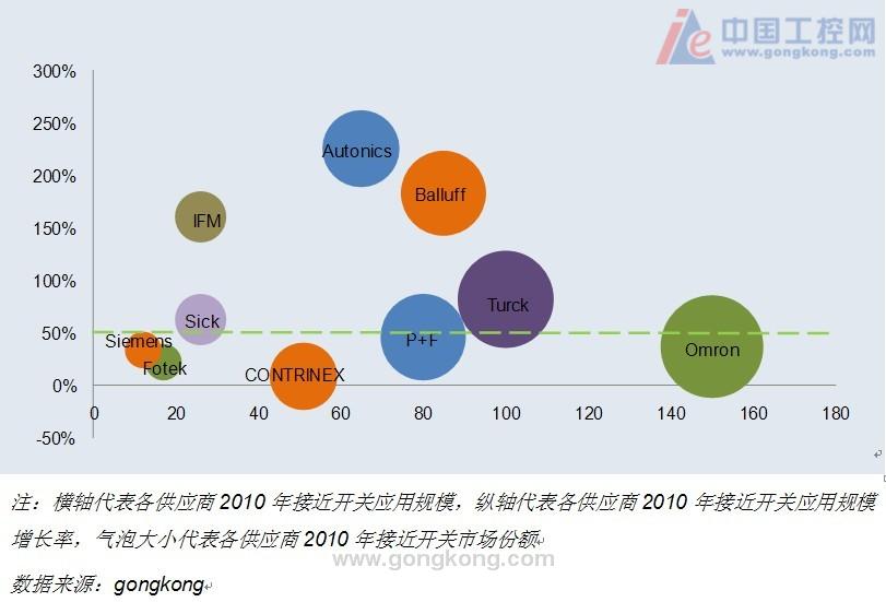 據(jù)gongkong《2011年中國離散傳感器市場研究報告》數(shù)據(jù)顯示,2010年離散傳感器市場迎來高速增長,市場規(guī)模達到34.5億人民幣,同比去年增長43.7%,其中光電開關(guān)和接近開關(guān)的增長幅度都超過了50%,編碼器增長幅度也超過40%,皆為2007年以來的最高水平。