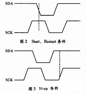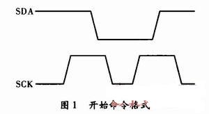 (1)傳輸開(kāi)始。在SCK為高時(shí)使SDA由高電平變?yōu)榈碗娖?,并在下一個(gè)SCK為高時(shí)將SDA升高,如圖1所示。