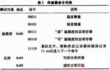 (2)地址與測(cè)試對(duì)象命令。該命令包含3個(gè)地址位和5個(gè)命令位,其后為應(yīng)答ACK位,表示SHT11正確收到命令。傳感器命令列表,如表2所示。