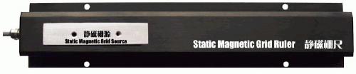 靜磁柵位移傳感器由“靜磁柵源”和“靜磁柵尺”兩部分結(jié)合使用。“靜磁柵源”使用鋁合金壓封無(wú)源釹鐵硼磁柵組成磁柵編碼陣列;“靜磁柵尺”用內(nèi)藏嵌入式微處理器系統(tǒng)的特制高強(qiáng)度鋁合金管材封裝,使用開關(guān)型霍爾傳感器件組成霍爾編碼陣列,鋁合金管材外部使用防氧化鍍塑處理。“靜磁柵源”沿“靜磁柵尺”軸線作無(wú)接觸(相對(duì)間隙寬容度和相對(duì)姿態(tài)寬容度達(dá)50mm)相對(duì)運(yùn)動(dòng)時(shí),由“靜磁柵尺”解析出數(shù)字化位移信息,直接產(chǎn)生高于毫米數(shù)量級(jí)的位移量數(shù)字信號(hào)。充分發(fā)掘嵌入式微處理器的資源,將數(shù)據(jù)更新速度提高到毫秒數(shù)量級(jí),以便能適應(yīng)5m/S以下運(yùn)動(dòng)速度的位移響應(yīng)。