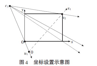 假設(shè)虛擬觸摸屏是如圖4所示的矩形區(qū)域,以左下角為原點(diǎn),建立二維坐標(biāo)平面x、y。左邊攝像頭c1位于虛擬觸摸屏左上角某處,其視角范圍應(yīng)包含整個(gè)矩陣區(qū)域,將c1與矩形的4個(gè)頂點(diǎn)連接構(gòu)成攝像頭拍攝各點(diǎn)的光線方向,以經(jīng)過左下角和右上角頂點(diǎn)的光線方向?yàn)檠?,c1為頂點(diǎn)作一個(gè)等腰三角形,底為虛線所示的(u1,u2)。當(dāng)手指在矩形區(qū)域內(nèi)任意一點(diǎn)觸摸時(shí),其在攝像頭所拍攝的圖像中均表現(xiàn)為虛線上的一點(diǎn),手指在二維虛擬觸摸屏上的移動投影到圖像上不會超過這條虛線(u1,u2)范圍,這是算法關(guān)注的興趣區(qū)域,區(qū)域以外的部分不需要處理。因此以u1為原點(diǎn)沿著虛線方向建立一維坐標(biāo)x1,右邊攝像頭拍攝圖像中的一維坐標(biāo)x2類似設(shè)立。