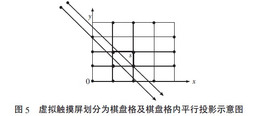 具體實(shí)施中,為準(zhǔn)確識別手指位置,將虛擬觸摸屏劃分為n×n 的棋盤格,如圖5 所示,由于攝像頭離棋盤格距離較遠(yuǎn),且每個(gè)棋盤格足夠小,于是可以假設(shè)在棋盤格內(nèi),攝像頭拍攝的光線是平行的,以簡化點(diǎn)位置的轉(zhuǎn)換。