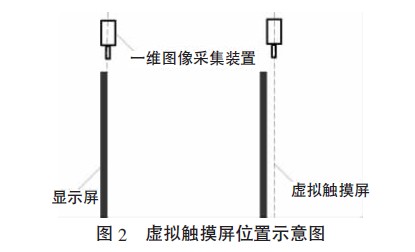 設(shè)計(jì)了一種虛擬觸摸屏系統(tǒng),其特色在于由圖像采集裝置獲取的一維圖像數(shù)據(jù)來確立用戶手指觸摸二維虛擬觸摸屏上的位置坐標(biāo)。前提是一維圖像采集裝置的安裝位置,它從根本上解決了大屏幕觸摸屏中人體遮擋手指無法識別的問題,且其進(jìn)行的是一維數(shù)據(jù)的處理,相比于二維圖像處理算法更加簡單。