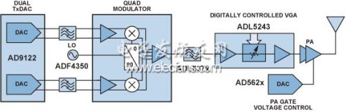圖5顯示了超外差式或ZIF發(fā)射機,該器件采用以下元件:TxDACAD9122、低通濾波器、正交調制器ADL537x、另一個RF濾波器、頻率合成器ADF4350、數(shù)字控制VGAADL5243、功率放大器、用于控制功率放大器(PA)柵極電壓的DACAD562x.