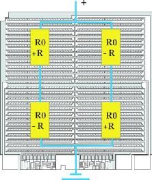 現(xiàn)代傳感器系統(tǒng)主要由兩個元件組成 —基本傳感器和信號處理專用集成電路 (ASIC)(圖 1)?,F(xiàn)已證明,后來由 Lord Klevin 于 1857 年發(fā)現(xiàn)的各向異性磁阻效應特別適用于檢測磁場。首先考慮通常具有多種磁疇結構的鐵磁性材料。這些稱之為韋斯磁疇的結構,其內部磁化的方向彼此不同。如果將這種材料平鋪為一薄層,那么磁化矢量處于材料層平面方向。另外,可較精確地假設只存在一個磁疇。當這種元件暴露于外部磁場中時,后者會改變內部磁化矢量的方向。如果同時一股電流通過該元件,就會產生電阻(圖 2),這取決于電流和磁化之間的角度。當電流和磁化方向彼此成直角時,電阻最小,當二者平行時,電阻最大。電阻變化的大小取決于材料。鐵磁性材料的性質也決定對溫度的依賴性。電阻最大變化為 2.2% 并且對溫度變化反應良好的最佳合金是 81% 的鎳和 19% 的鐵組成的合金。恩智浦所有傳感器系統(tǒng)中的基本傳感器都采用這種強磁鐵鎳合金。在惠斯登電橋電路中單獨配置幾個 AMR 電阻,以增強輸出信號并改善溫度反應特性。此電路也可在制造過程中進行微調。圖 3 顯示如何在裸片上配置 AMR 元件。