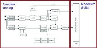 確定磁場之后是傳感器系統(tǒng)仿真。AMR 元件的電阻變化是各向異性磁阻效應的直接結果。這樣,磁場仿真的結果會導致代表信號處理中輸入信號的電阻發(fā)生變化。對模擬前端進行建??刹捎?Simulink。這種行為模型是概念設計的產物,標志著產品開發(fā)的起點。每個 Simulink 塊對應一個模擬信號處理組件,例如放大器或過濾器。但是,尚未考慮模擬組件的控制部分,這由數(shù)字系統(tǒng)實現(xiàn)。HDL 設計則仿真通過數(shù)字方法實現(xiàn)的功能,而且在完成產品開發(fā)之后就會最終成形。因此,整體系統(tǒng)仿真是 Simulink 對模擬組件的行為模型以及 ModelSim 對 HDL 設計的共同仿真(圖8)??赏ㄟ^仿真從概念階段順利過渡到 HDL 設計及后續(xù)階段。在共同仿真中,可用 ModelSim 中部署的 Verilog 代碼逐漸代替 Simulink 參考模型,從而可逐項驗證 HDL 設計??沙掷m(xù)進行此過程,直到在 Verilog 中實現(xiàn)整個數(shù)字部件,而模擬系統(tǒng)部件仍保持為 Simulink 模型。此工具組合也已證明對 IC 評估同樣有用。自始至終使用這種工具可以更容易理解 IC 行為,并可創(chuàng)建用來分析和解釋任何錯誤的框架。這些工具的主要好處在于,能夠更快速、更準確地答復客戶的查詢,以及更好地了解與環(huán)境條件相關的傳感器功能。