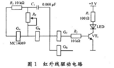為減少自然光、照明光和其他干擾光的影響,需對反相器電路產(chǎn)生的脈沖輸出進(jìn)行脈沖調(diào)制,反相器中的GA和GB構(gòu)成振蕩電路,如果反相器GA和GB的門限電平為1/2Ucc(Ucc為MC14069電源電壓),則電路的振蕩頻率f,由電容C1和電位器Rp 的值決定,即f=1/(2.2Rc)。其中,R為Rp的阻值,C為C1 的電容值。