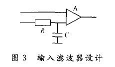 對于高精度mV 級的DC放大器,其各種交流干擾都將成為放大器寄生信號的重要信號源,因此,必須在運(yùn)算放大器的輸入端加輸入濾波器,通常由一個大電阻(4.7 kΩ)和一個小電容(3.3μF)構(gòu)成RC濾波,如圖3所示。